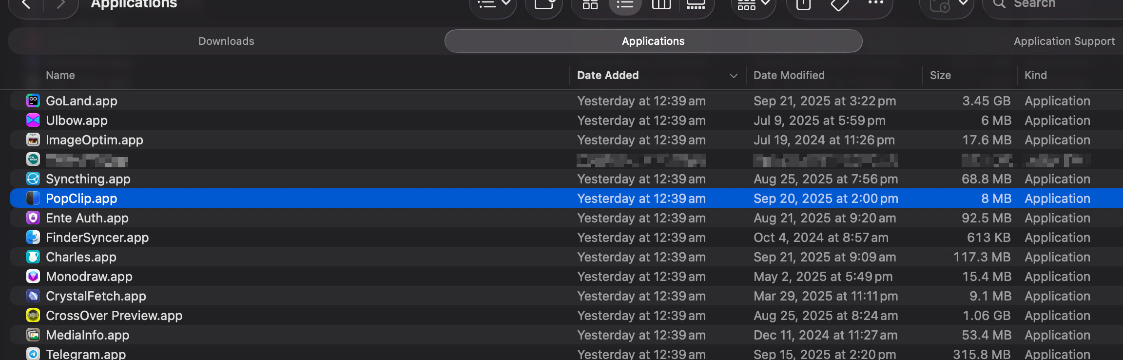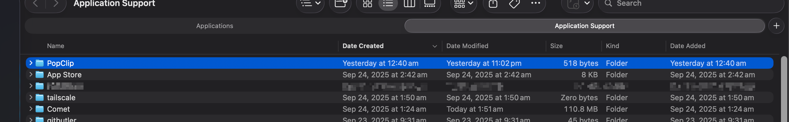 Notice in the screenshot below that the ~/Library/Application Support/PopClip was created right 1 minute after that at 12:40am. The list is sorted by “Date Created” so PopClip seems to the only app affected by this